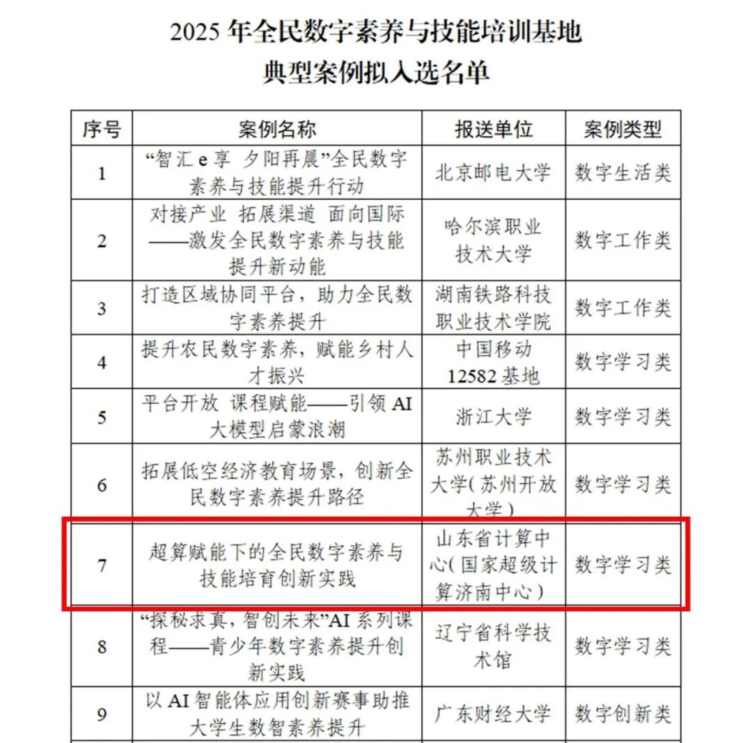 为深入实施《提升全民数字素养与技能行动纲要》,充分发挥国家全民数字素养与技能培训基地的示范引领作用,中央网信办会同有关部门组织开展了2025年全民数字素养与技能培训基地典型案例遴选工作。经省级推荐、专家评审和部门会商等环节,共遴选出12个具有全国代表性和推广价值的典型案例。其中,国家超级计算济南中心(以下简称“济南超算”)报送的“超算赋能下的全民数字素养与技能培育创新实践”成功入选,成为我省唯一入选的典型案例,充分彰显了济南超算在数字教育创新与全民数字素养提升领域的建设成效与引领作用,获得国家层面高度认可。