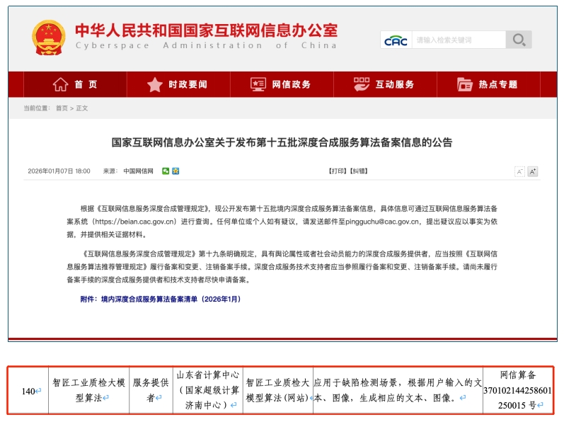 1月7日,国家互联网信息办公室正式发布第十五批境内深度合成服务算法备案信息。其中,由齐鲁工业大学(山东省科学院)计算机科学与技术学部信息化战略与标准研究团队自主研发、依托国家超级计算济南中心算力资源支撑训练的“智匠工业质检大模型算法”,凭借其自主可控的技术架构及全链路安全防护机制成功通过备案审核,标志着学部在人工智能关键技术研发、算法安全治理和规范化应用方面取得重要进展,其相关研究成果在国家层面获得权威认可。