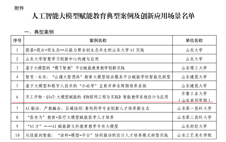 近日,山东省教育厅印发《关于推广人工智能大模型赋能教育典型案例及创新应用场景的通知》(鲁教字〔2026〕23号),公布了人工智能大模型赋能教育典型案例及创新应用场景名单。由计算学部网络计算与大数据科研团队联合计算机科学与技术(物联网工程)系教学团队申报的案例“齐工开物·QIoT:大模型赋能的《物联网工程与实践》智能教学系统设计与应用” 成功入选人工智能大模型赋能教育典型案例。