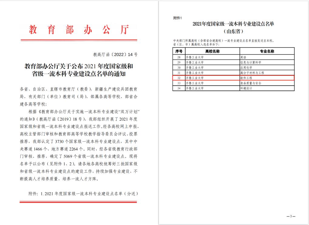 日前,教育部办公厅发布《关于公布2021年度国家级和省级一流本科专业建设点名单的通知》,齐鲁工业大学计算学部软件工程专业获批国家级一流本科专业建设点,这是学部继物联网工程获批国家级一流本科专业建设点之后的又一突破。