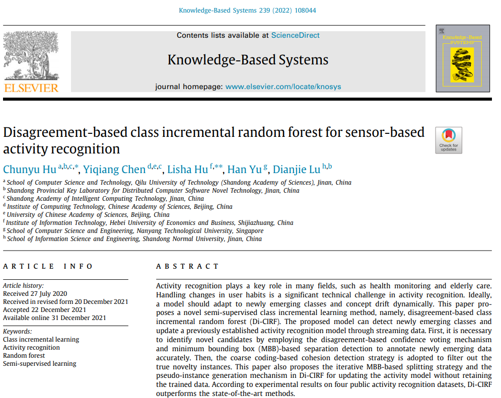 基于日常行为识别的健康监护,是发现健康异常并为慢性疾病提供早期预警的重要手段。而实际应用场景中的动态变化,是实现实时、精准行为识别的重要挑战之一。针对这一问题,计算学部胡春雨博士与中科院计算所、南洋理工大学等机构研究人员合作,在人工智能领域国际知名期刊《Knowledge-based Systems》上发表了题为“Disagreement-Based Class Incremental Random Forest for Sensor-Based Activity Recognition”的论文,胡春雨为论文第一作者,齐鲁工业大学(山东省科学院)计算机科学与技术学院为第一完成单位。